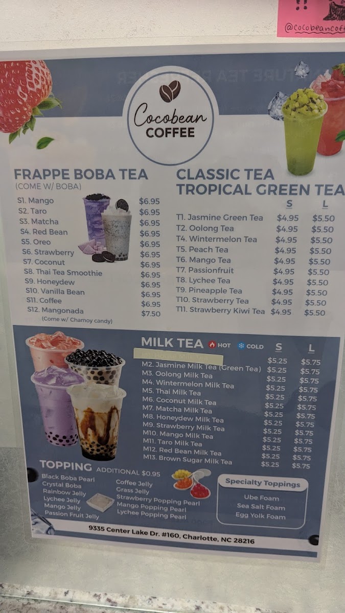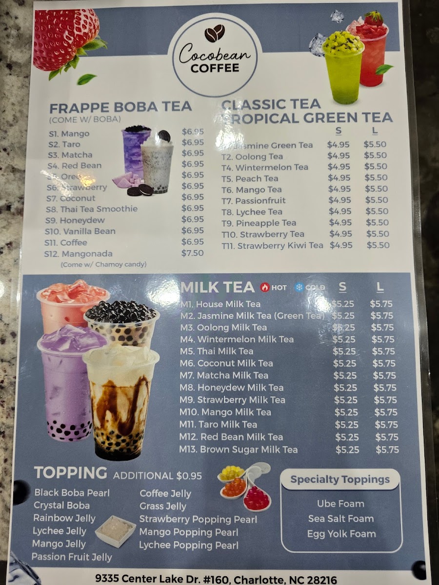 Welcome to Cocobean Coffee and Boba Tea, a delightful café located in the heart of Charlotte, NC. This charming spot is a haven for tea enthusiasts and coffee lovers alike, offering a wide variety of beverages that satisfy every palate. At 9335 Center Lake Dr # 160, Cocobean is not just about drinks; it's an experience that awakens your senses and brings a smile to your face.